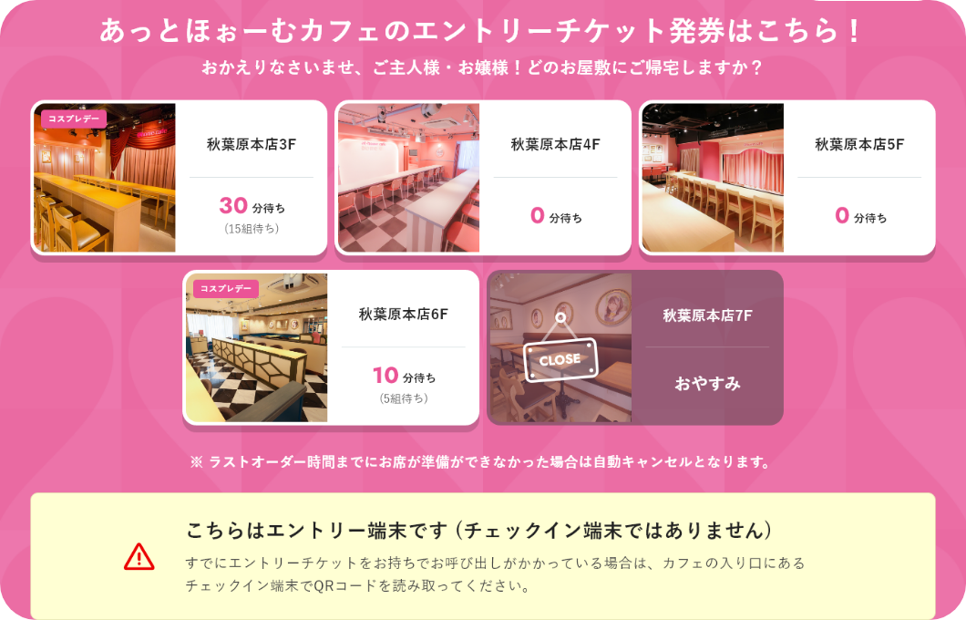 お屋敷のエントランスにあるエントリーアプリからご帰宅したいお屋敷の整理券を発行!