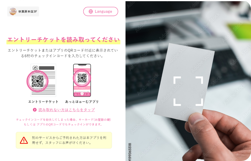 - チェックインアプリは各お屋敷の入り口にございます。エントランスのエントリーアプリとお間違いのないようご注意ください。